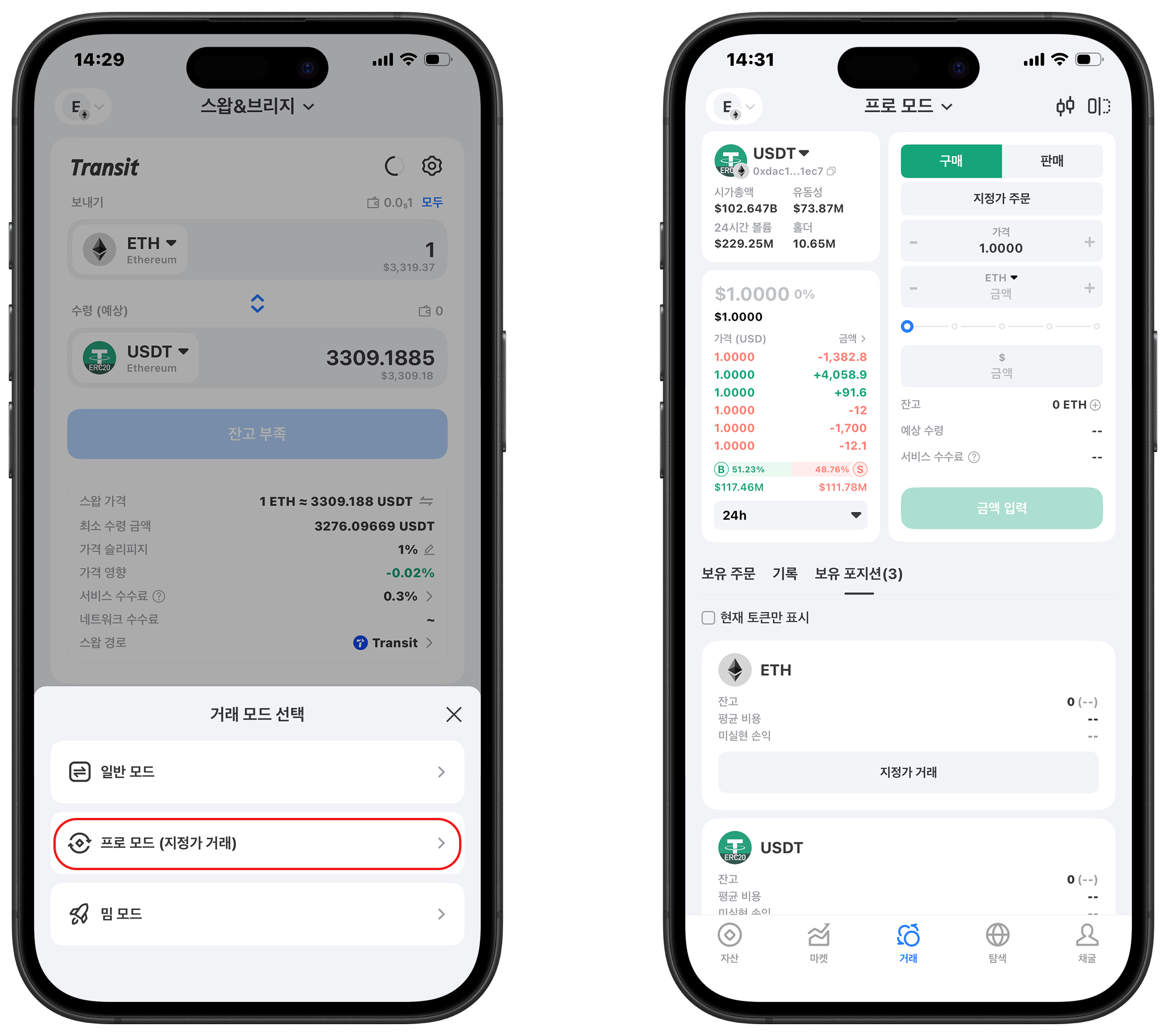 페이지 상단에서 "스왑 및 브리지"를 클릭하고 메뉴에서 "프로 모드(지정가 주문)"를 선택합니다. 이제 TokenPocket 지정가 주문 거래 페이지에 진입했습니다.