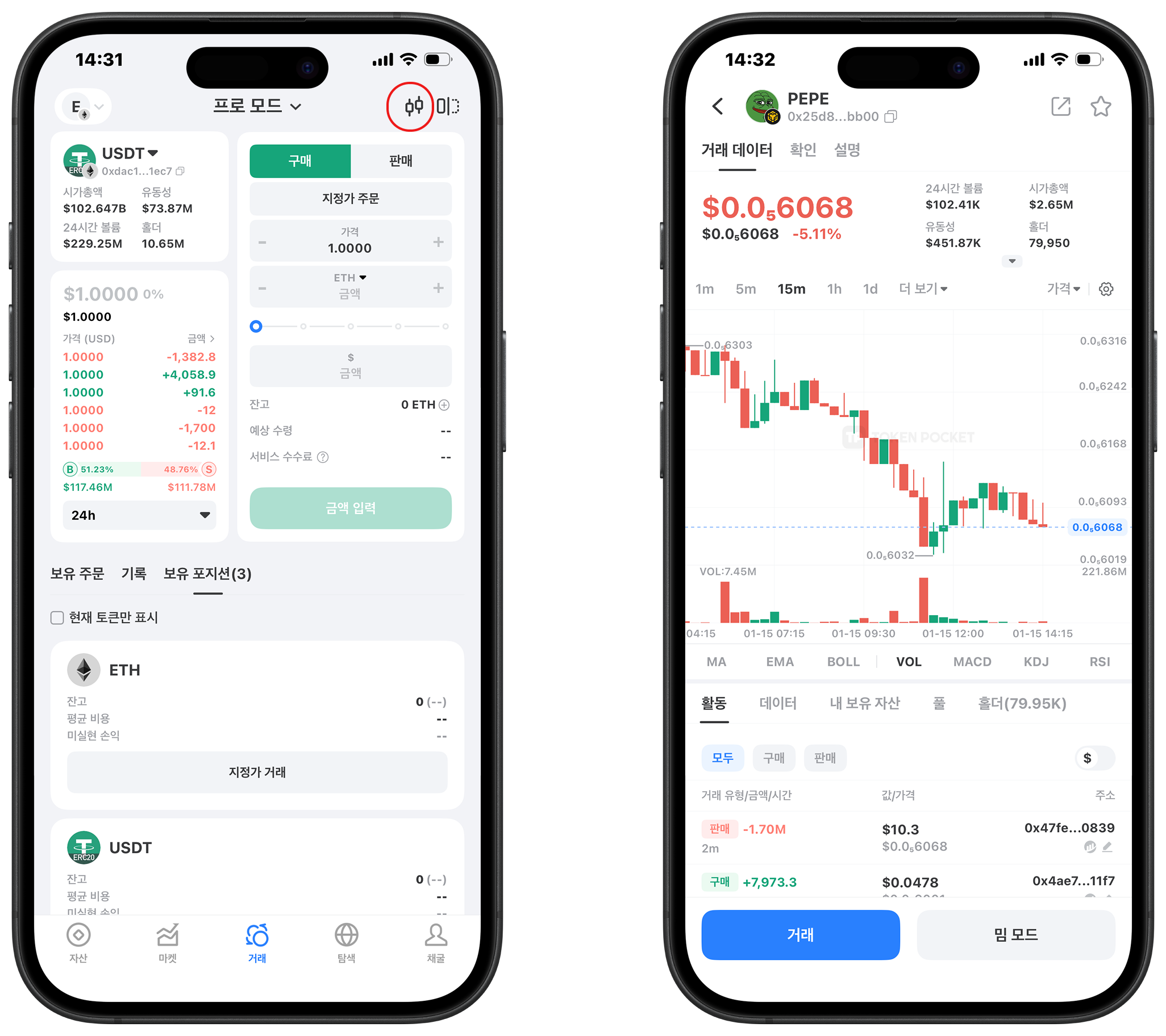 대상 토큰의 시장 세부 정보는 오른쪽 상단의 캔들스틱 차트 아이콘을 클릭하여 확인할 수 있습니다.
