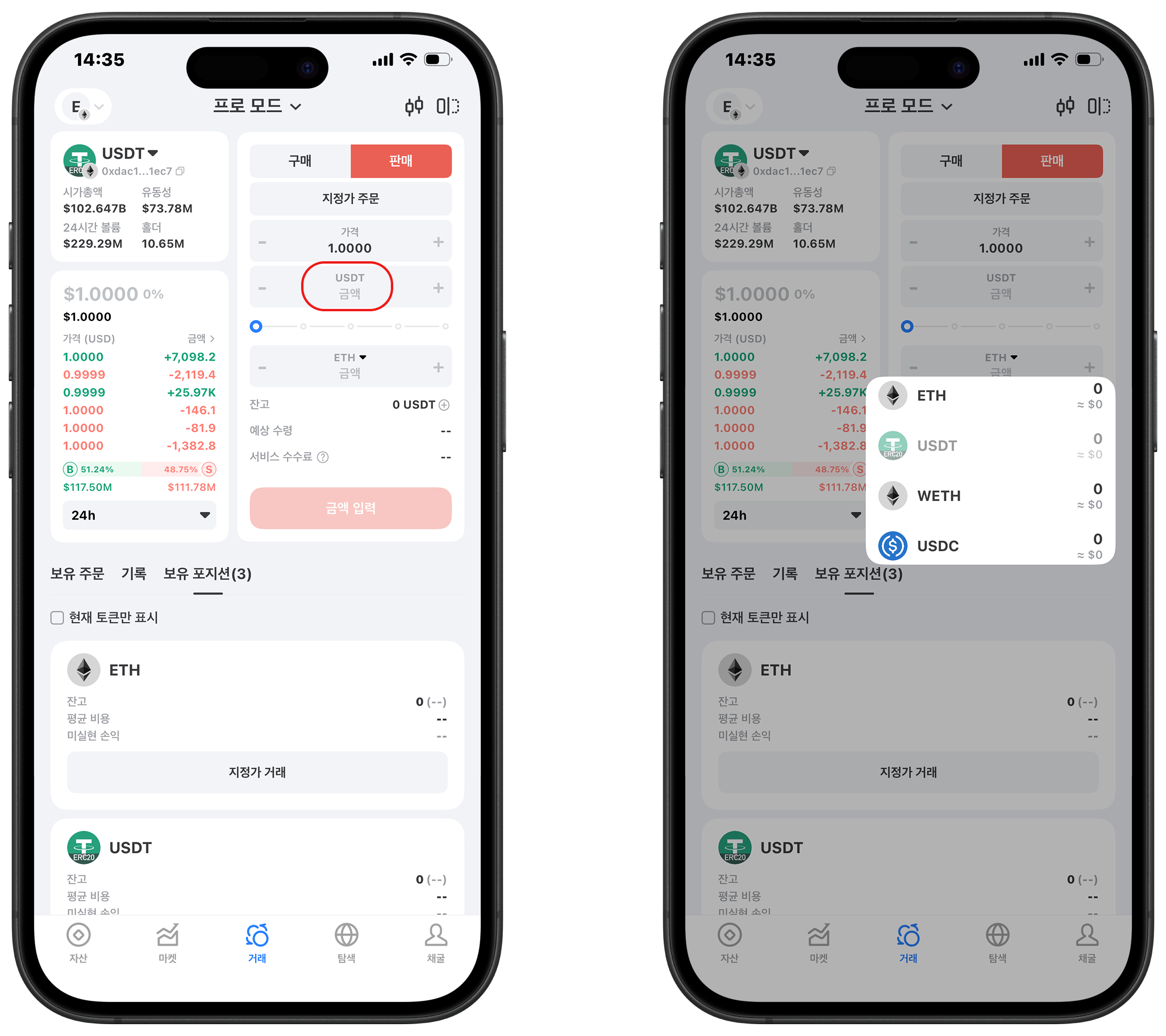 오른쪽 패널을 통해 토큰의 특정 매수/매도 설정을 구성합니다. 이미지의 드롭다운 메뉴를 클릭하여 대상 토큰의 매수 토큰/매도 토큰을 선택합니다. 예를 들어, ETH는 지정가 주문 매수/매도를 위해 USDT/WETH/USDC를 선택할 수 있습니다.